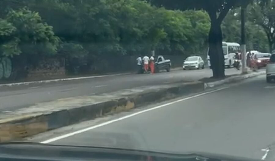 Um forte impacto entre dois veículos chamou a atenção de quem passava pela Avenida Coronel Teixeira na manhã desta sexta-feira (19), no sentido Ponta Negra, na Zona Oeste de Manaus. A colisão envolveu uma picape de cor preta e um carro sedan vermelho, que acabou arremessado para o canteiro central da via após a batida.