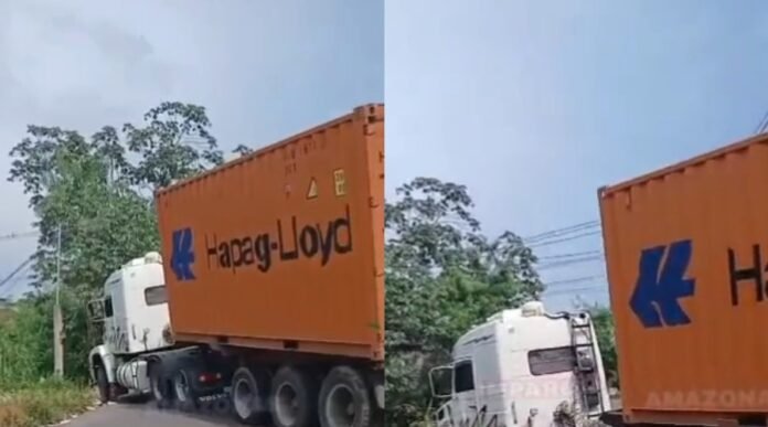 Um caminhão do tipo carreta, carregado com um contêiner, acabou bloqueando totalmente a Rua 5, no Conjunto Boas Novas, bairro Manoa, Zona Norte de Manaus, na manhã desta quarta-feira (6), após não conseguir subir uma ladeira íngreme.