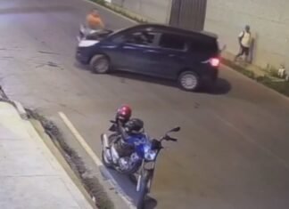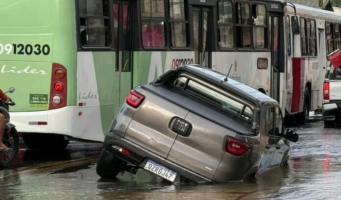 Moradores relatam que o buraco se formou de maneira repentina e acabou tomando parte da via. O motorista não conseguiu desviar e o carro acabou sendo engolido.