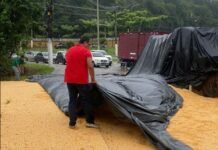 Caminhão carregado de milho tomba e complica trânsito na Avenida do Turismo em Manaus
