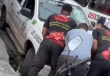 Viatura da PM cai em cratera e é retirada com ajuda de moradores na...