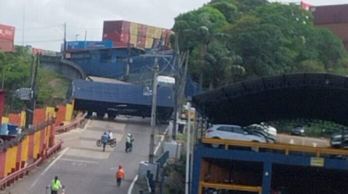 O incidente ocorreu durante uma manobra, quando a estrutura se soltou do caminhão e caiu sobre a pista. O bloqueio interrompeu o fluxo de veículos e impactou o deslocamento de trabalhadores e transportadoras que dependem do porto para atividades logísticas.