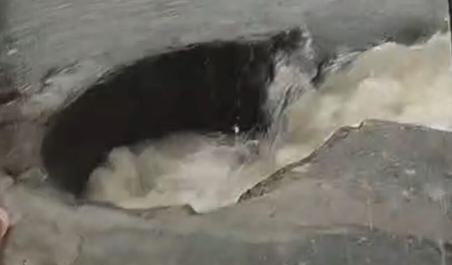 Um vídeo registrado por um morador mostra a rua tomada pela água e um brinquedo da criança sendo levado pela enxurrada.
