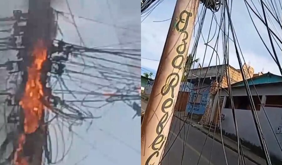 Um morador não identificado, enfrentou transtornos desde as primeiras horas desta quinta-feira (15), após um poste de iluminação pública pegar fogo e provocar a queda de cabos de internet e telefonia, que ficaram estendidos em frente ao portão da garagem, impedindo completamente a saída do veículo na Rua Andirá-Açú, no Rio Piorini, Zona Norte de Manaus.