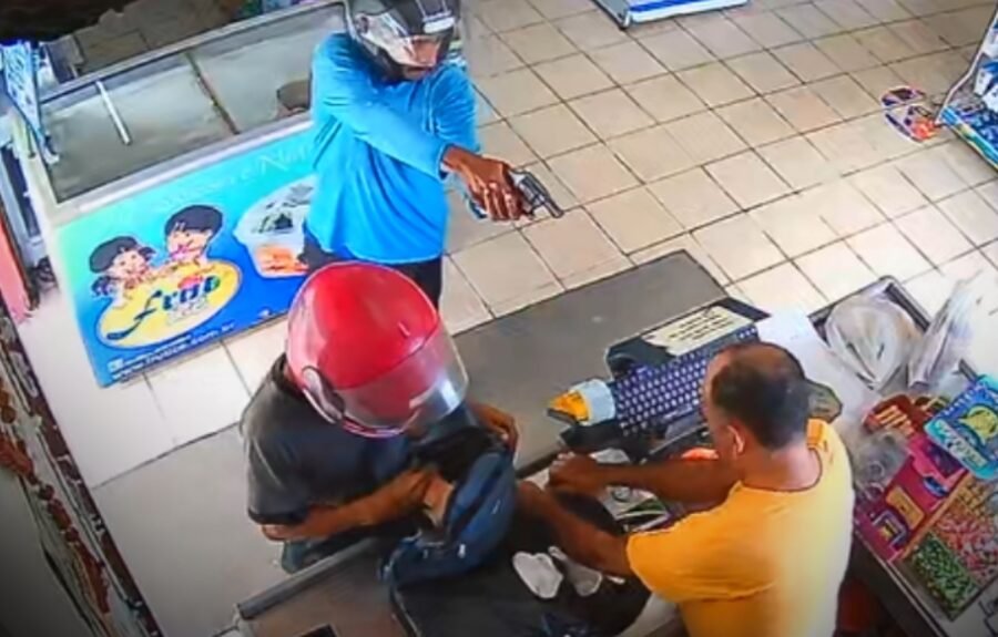 Imagens de câmeras de segurança registraram a dinâmica do crime. O vídeo mostra dois homens chegando ao local de capacete, entrando no comércio e anunciando o assalto. Um deles aparece armado e domina um cliente próximo ao balcão, enquanto o proprietário é obrigado a entregar os pertences sob ameaça.
