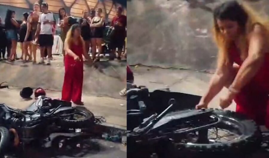 Nas gravações, uma motocicleta aparece caída no chão enquanto uma mulher perfura o pneu do veículo. Durante a ação, ela afirma que o bem teria sido comprado com o próprio dinheiro, o que aumentou ainda mais a repercussão entre os presentes. A cena se passa em meio a uma discussão acalorada, cercada por curiosos que acompanhavam tudo de perto.