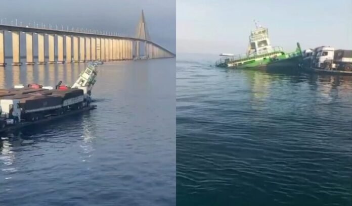 Nas imagens, a embarcação aparece afundando de forma repentina até desaparecer nas águas. O empurrador transportava caminhões em balsas, mas os veículos não sofreram danos visíveis e permaneceram intactos.