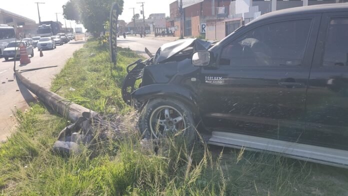 Uma caminhonete Hilux desgovernada derrubou um poste na avenida José Henrique Bentes, na Colônia Terra Nova, Zona Norte de Manaus, durante a madrugada desta segunda-feira (10).