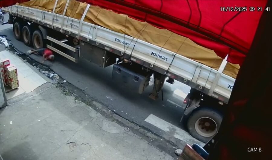 As imagens revelam o homem caminhando pela calçada antes de descer para a rua, exatamente no instante em que a carreta inicia uma manobra para deixar o local. Durante o movimento do veículo, o idoso perde o equilíbrio, cai e acaba ficando sob a estrutura da carreta. Apesar do risco iminente, as rodas traseiras não passam sobre o corpo da vítima, evitando um desfecho fatal.