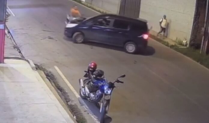 Com a colisão, o piloto da moto é lançado para cima do carro e cai no asfalto após o impacto. O registro também mostra que ele não utilizava capacete.