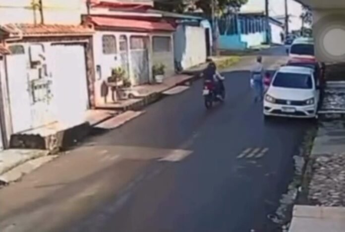 Uma mulher que caminhava ao lado de uma criança foi vítima de um assalto, na manhã de sábado (27), no Nova Esperança, Zona Oeste de Manaus. A ação criminosa, registrada por câmeras de segurança, ocorreu por volta das 8h, quando dois homens em uma motocicleta abordaram a vítima e levaram o celular.