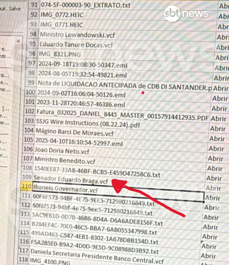 Imagens do aparelho indicam que a agenda telefônica do investigado continha números de diversas autoridades do cenário político e institucional do país. Entre eles estão o Presidente do Senado, Davi Alcolumbre, e o Presidente da Câmara dos Deputados, Hugo Motta.