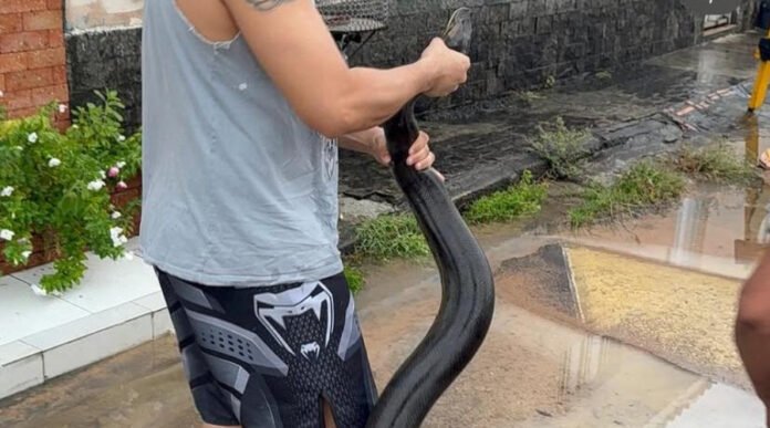 Uma sucuri de quase quatro metros de comprimento foi flagrada circulando em uma rua do Parque 10, na Zona Centro-Sul de Manaus, durante o forte temporal que atingiu a cidade na tarde deste domingo (5). O aparecimento do animal em meio à chuva intensa e ventos fortes assustou os moradores, que registraram o momento em vídeos compartilhados nas redes sociais.