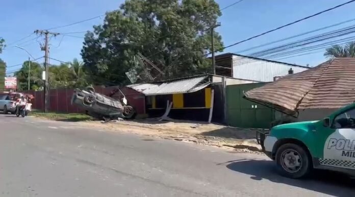 Veículo capota e destrói casas após colisão com poste na Estrada do Tarumã-Açu em Manaus