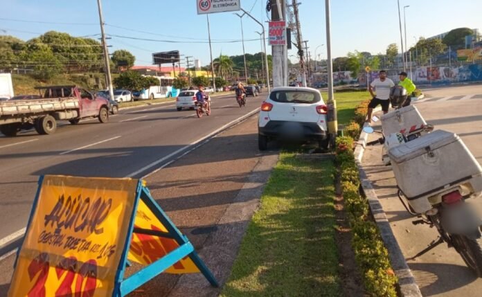 Um veículo de aplicativo colidiu contra um poste na manhã desta terça-feira (19), na Avenida Torquato Tapajós, em frente ao Supermercado Assaí, no Flores, Zona Centro-Sul de Manaus.