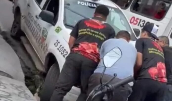 Para retirar o veículo do buraco, os policiais precisaram da ajuda de populares que passavam pelo local. As imagens mostram moradores empurrando a viatura até que ela fosse removida da cratera.