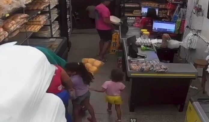 Dois suspeitos entraram no comércio exibindo armas de fogo, enquanto o terceiro permaneceu do lado de fora fazendo a vigilância. Clientes, inclusive crianças, foram rendidos e conduzidos para os fundos da loja durante o roubo.